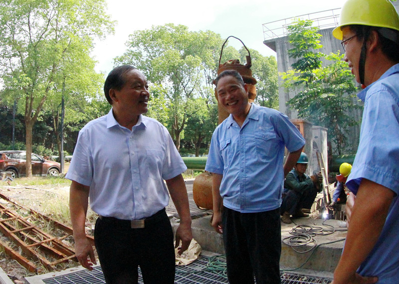 圖為集團副總經理、紹興水處理公司董事長胡張堯在紹興水處理公司放空泵房導軌更換現場慰問維修人員