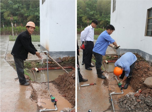 為盡快幫助村民解決用水問題,安裝小組冒雨前往。在安裝現場,我們看到有人在使用套絲機,有人在接水管,大伙忙的不亦樂乎。經過2個小時的奮戰,順利為其接通水源,安好水表,并裝好了水龍頭。當現場看到水龍頭流出水的那瞬間,大家的心情都非常激動,費某的臉上更露出了久違的笑容,欣喜的用手接起了新家的“第一股清泉”。