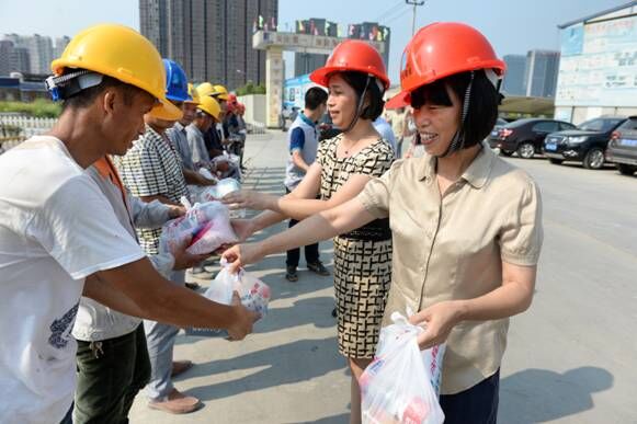 慰問現場,成水鳳一行向奮戰在一線的施工人員送上防暑用品,與工人們握手,詢問工人工作情況和工地的防暑降溫工作,對工人們的辛苦奉獻表示感謝,還特別叮囑工人一定要注意防暑降溫,合理安排施工時間,在安全的前提下保質保量地完成施工任務。
